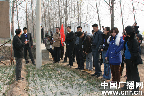 負(fù)責(zé)人在給記者同行們講解“無公害”大蒜與“有機”大蒜的區(qū)別(記者陳佳 攝)