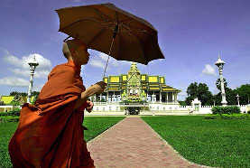 手持遮陽(yáng)傘的僧侶從金邊王宮前經(jīng)過(guò) |