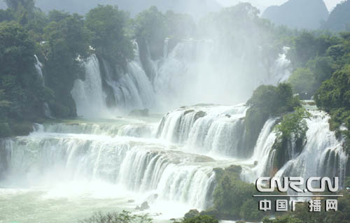 中廣網(wǎng)南寧10月6日消息(記者張江元)德天瀑布位于廣西大新縣中越邊境交界處的歸春河上游,它與緊鄰的越南板約瀑布相連,形成了世界第二、亞洲第一大跨國(guó)大瀑布。受今年第14號(hào)臺(tái)風(fēng)“黑格比”的影響,流域內(nèi)普降大到暴雨。豐沛的水量,給瀑布增添了無窮的活力。幾公里外已聞濤聲如吼,近觀則奔流飛瀉,盡顯磅礴之景象。