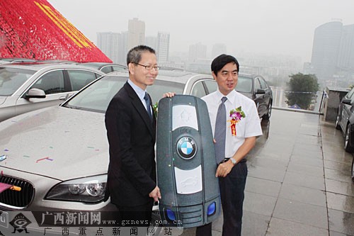 寶馬(中國(guó))銷(xiāo)售副總裁許智俊先生(左)向廣西國(guó)際博覽事務(wù)局局長(zhǎng)鄭軍。ㄓ遥┻f交“車(chē)鑰匙”。(來(lái)源:廣西新聞網(wǎng))