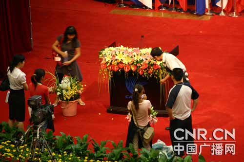 工作人員正在用鮮花裝飾演講臺(tái)(中廣網(wǎng)記者董雯 攝)