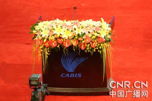 鮮花簇?fù)淼难葜v臺(tái)(中廣網(wǎng)記者董雯 攝)