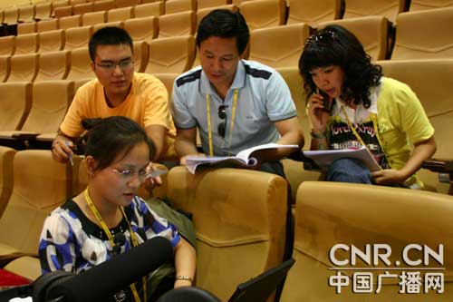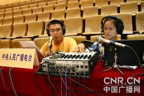 中央臺記者、主持人馮雅與廣西人民廣播電臺主持人張杰正在為第六屆中國-東盟商務與投資峰會直播進行試音(中廣網(wǎng)記者董雯 攝)