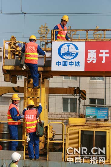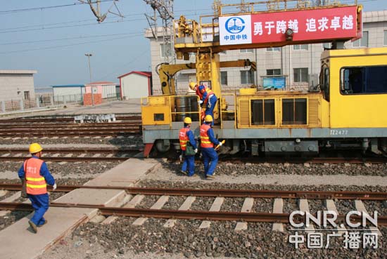 遷曹線曹妃甸南站施工路段,巨曉林和他的工友拿好工具開(kāi)始工作,畫(huà)面左下方穩(wěn)穩(wěn)邁步的為巨曉林忙碌的背景。(記者 曾靈華 攝)