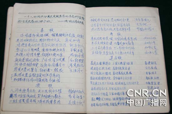 巨曉林會(huì)寫(xiě)對(duì)聯(lián),筆記簿上密密麻麻的是他分類的對(duì)聯(lián)。妻子宋小平說(shuō)他回家過(guò)年時(shí)會(huì)幫村里的人寫(xiě)。(記者 曾靈華 攝)