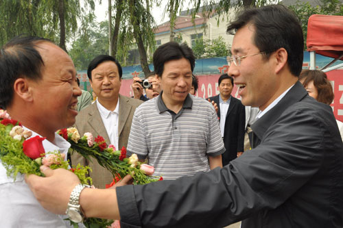 岐山縣委書記孫毅為回家鄉(xiāng)探親的農(nóng)民工巨曉林披上花環(huán)