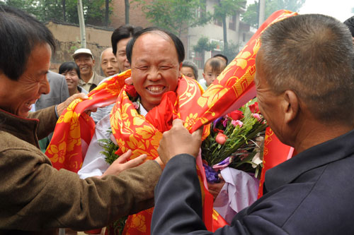鄉(xiāng)親們?yōu)榧亦l(xiāng)驕子巨曉林披紅獻(xiàn)花