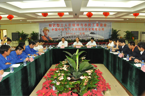 6月13日下午,從中國中鐵電氣化局集團(tuán)西安電化公司機(jī)關(guān)駐地寶雞的會議室里不時的傳來一陣陣熱烈的掌聲和歡笑聲。知識型工人、農(nóng)民工楷模、中國中鐵電氣化局集團(tuán)一公司農(nóng)民工巨曉林與西安電化公司農(nóng)民工代表座談會正在進(jìn)行。