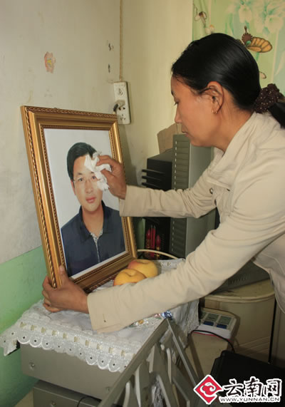 鄭坰靖一心只為工作。對工作、對群眾他細致入微;而對自己、對家人他卻無暇照顧。他和楊翠芝結(jié)婚多年,可鄭坰靖從未帶妻子和女兒出去玩過?粗崍s靖的遺像,楊翠芝流下了悲傷的淚水。(圖片來源:云南網(wǎng))