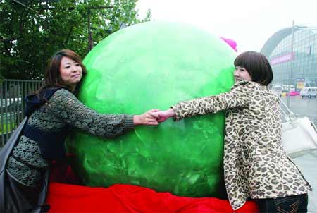 這顆夜明珠已被評為上海大世界基尼斯之最。由于它的體積太大,怕擺放到展館里面壓壞地面,因此在展覽期間繼續(xù)放置在場館外,這樣的話,即使是在夜晚的時候,市民從此經(jīng)過都能看到夜明珠的光芒。據(jù)悉,這顆夜明珠是由一個礦工在云南發(fā)現(xiàn)的,當時是不規(guī)則的形狀,體積有7噸多,后來經(jīng)過打磨之后才變成圓形。 記者 楊利娜/文 沈繼軍/圖 |