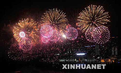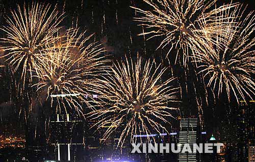 當(dāng)日,香港特區(qū)政府為慶祝國(guó)慶,在維多利亞港上空舉行煙花匯演。 新華社記者 吳曉初攝