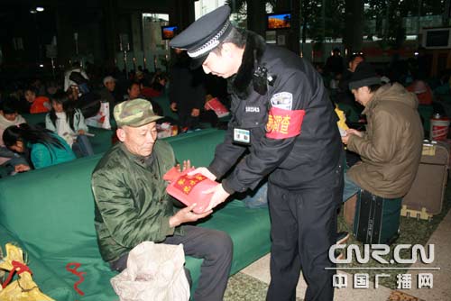 南寧鐵路警方從“關(guān)注民生”出發(fā),自發(fā)捐款購(gòu)買(mǎi)暖水袋送給在寒冷天氣中候車(chē)的老人、婦女和小孩,給他們送去關(guān)懷和溫暖,贏得了旅客的高度贊揚(yáng)。