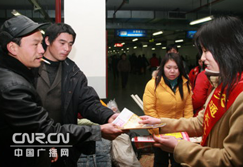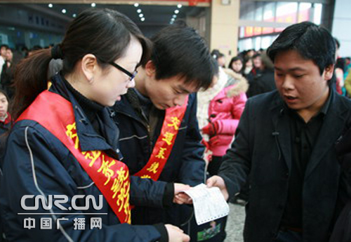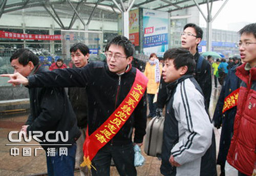 今天上午8點半,志愿者準時在火車南站廣場集合,分成維護秩序、問訊指路、提供幫扶等五個小分隊,隨即志愿者各就各位,又開始了一天忙碌而緊張的工作。青年志愿者小張和其他五名隊員帶上預(yù)先從家里、單位收集的一些報刊雜志,急匆匆趕到南站廣場地下停車庫的旅客臨時候車室,送給滯留旅客閱讀,以緩解乘客等候多時的焦慮心情;之后,他們又給旅客送上了一杯杯熱騰騰的姜茶,為寒冷中的旅客送上了一份溫暖。