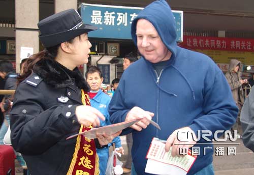 長沙鐵路公安處民警為外國旅客朋友發(fā)放宣傳資料并提供咨詢服務(wù)
