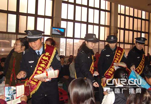 長沙鐵路公安處團員青年民警為旅客發(fā)放安全出行宣傳資料及警民聯(lián)系卡