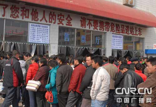 記者日前在南陽火車站看到,車站廣場和臺階上已經(jīng)成了農(nóng)民工旅客和行李的海洋,結(jié)束了與家人短暫的新年團(tuán)聚,他們又要奔赴北京、廣州等地,開始打工歷程。在南陽車站的站前廣場搭建了面積達(dá)2000平方米的臨時候車廳,臨時候車廳按照車次、方向劃分了若干區(qū)域,并設(shè)置了醒目的引導(dǎo)牌,農(nóng)民工朋友有的三五成群地聊天,有的在臨時搭建的候車棚小睡一會兒,雖然人多,但整個車站的秩序還很好。15號南陽車務(wù)段共發(fā)送旅客27503人,南陽火車站發(fā)送旅客達(dá)1萬5千余人,達(dá)到了輸送旅客歷史水平最高。