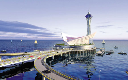 記者在海中平臺的效果圖上看到,這一平臺形似展翅的雄鷹,又如巨手托起的珍珠。該平臺位于杭州灣跨海大橋南航道橋以南約1.7公里下游150米處,距南岸約14公里。
