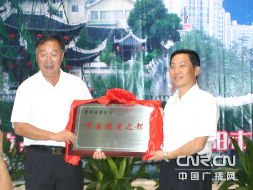 中國氣象學(xué)會(huì)秦大河院士代表中國氣象學(xué)會(huì)向貴陽市人民政府市長袁周授予貴陽市“中國避暑之都”牌匾