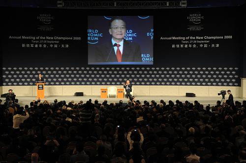 9月27日,世界經(jīng)濟(jì)論壇2008年新領(lǐng)軍者年會(huì)在天津?yàn)I海新區(qū)開幕。中國國務(wù)院總理溫家寶出席開幕式并致詞。新華社記者 馬平 攝