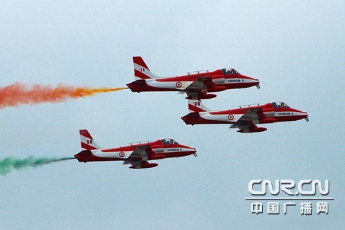 印度“陽(yáng)光”飛行表演隊(duì)進(jìn)行精彩飛行表演(攝影:杜志河)
