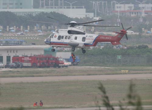 除了驚險(xiǎn)的特技飛行,昨天EC225還演示了救助飛行隊(duì)特有的救助科目:先超低空懸停,救生員抱著擔(dān)架下到地面,直升機(jī)上升一定高度后,另一名救生員李春林順著鋼纜降至地面,迅速將擔(dān)架假人吊運(yùn)回直升機(jī)等。精彩再現(xiàn)了救援直升機(jī)執(zhí)行任務(wù)時(shí)的真實(shí)過程。之后,EC225輕巧地向觀眾“點(diǎn)頭”致敬,贏得了觀眾的陣陣掌聲。