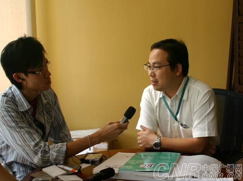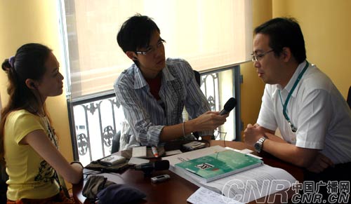 記者趙婷婷、王浩在采訪澳門特別行政區(qū)政府文化局副局長(zhǎng)陳澤成
