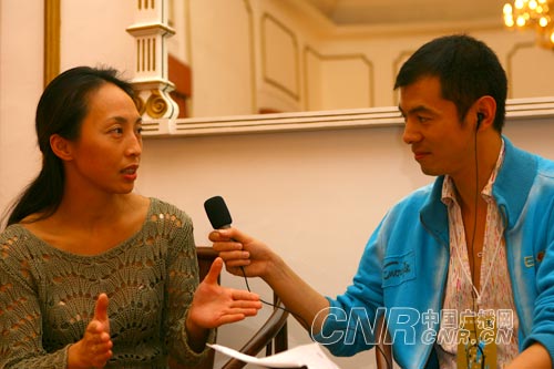 23日,“柏林嬉游小重奏”在澳門崗頂劇院為澳門音樂愛好者奉獻(xiàn)了一場精彩的、令人回味無窮的室內(nèi)樂精品演出。演出前,中央臺華夏之聲記者張旭采訪了“柏林嬉游小重奏”的成員、來自上海的女小提琴家張纓(左)。據(jù)悉,張纓使用的小提琴是1690年由弗蘭西斯科·魯吉利制造的克雷莫納名琴。 中廣網(wǎng)記者李洪濤 攝