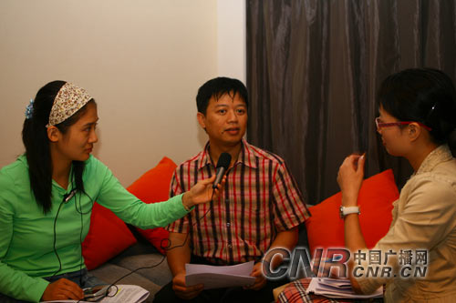 中央臺記者宋薇(左)采訪印尼巴塔維亞牧歌合唱團(tuán)的青年指揮阿維普·浦里亞特納。 中廣網(wǎng)記者李洪濤 攝