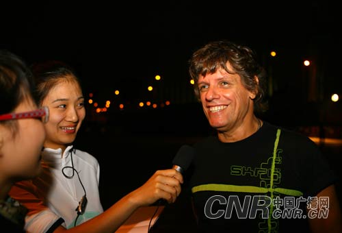 27日,來(lái)自葡萄牙的“踢吧”搖滾樂(lè)隊(duì)在激昂熱烈的樂(lè)曲聲中,為澳門(mén)搖滾樂(lè)迷奉獻(xiàn)了一場(chǎng)極富激情、活力的搖滾樂(lè)演唱會(huì),南灣湖廣場(chǎng)再一次迎來(lái)了一個(gè)不眠之夜。圖為中央臺(tái)華夏之聲記者宋薇采訪樂(lè)隊(duì)創(chuàng)始人之一、吉他手施·彼得(右)。 中廣網(wǎng)記者李洪濤 攝