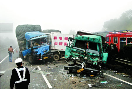 (12月15日上午,大霧天氣能見度降低,京珠高速臨長段發(fā)生多起汽車追尾事故)