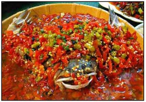 “剁椒魚頭”是采摘湖南瀏陽東鄉(xiāng)的正宗剁辣椒,加上新鮮紫蘇,在特定的蒸汽壓力、時間及溫度的作用下,一道色澤紅艷、鮮美無比的“剁椒魚頭”送上餐桌。吃剁椒魚頭要從魚嘴開始下筷,魚嘴、魚鰓、劃翅等活肉澆著湯汁慢慢品嘗。魚頭吃完后,再來上一份面條,放在剩余的湯汁中拌著吃,那才真的叫陶醉。雖然魚頭上布滿了紅紅的剁椒,但卻很少感受到辛辣的刺激,這就是發(fā)酵的剁椒與干辣椒的不同之處。