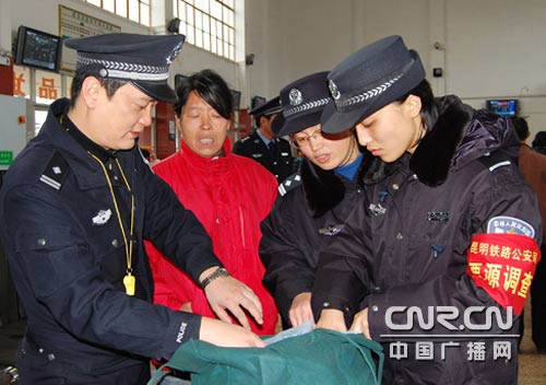 云南開遠(yuǎn)鐵路公安處的民警們嚴(yán)格檢查,確保春運(yùn)安全。