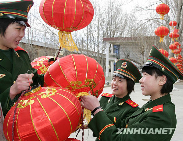 1月20日,武警西藏總隊(duì)通訊站的女戰(zhàn)士在營(yíng)區(qū)掛紅燈籠。新華社發(fā)(趙艷志 攝)