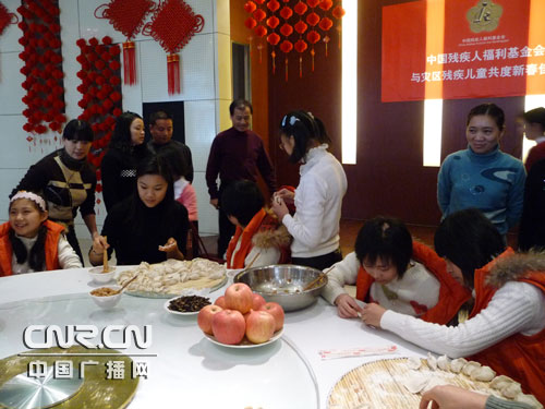 中廣網(wǎng)北京1月25日消息(記者王淑娟實(shí)習(xí)記者張雪)大紅的窗花貼起來(lái),喜慶的燈籠掛起來(lái)。除夕的中國(guó)康復(fù)研究中心歡歌笑語(yǔ),暖意融融。中國(guó)殘疾人福利基金會(huì)、首都各界愛心人士、醫(yī)務(wù)工作者和正在這里康復(fù)治療的汶川地震災(zāi)區(qū)的孩子們一起貼窗花、包餃子,度過(guò)了一個(gè)喜慶的團(tuán)圓年。