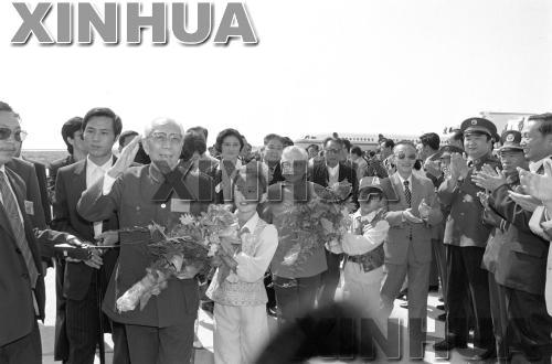 1988年9月21日上午,以王震為團(tuán)長、雷潔瓊為副團(tuán)長的中央代表團(tuán)抵達(dá)銀川,參加寧夏回族自治區(qū)成立三十周年慶祝活動,在機場受到寧夏回族自治區(qū)領(lǐng)導(dǎo)和當(dāng)?shù)馗髯迦罕姷臍g迎。新華社記者 陳思禹 攝