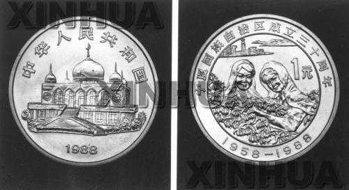 為慶祝寧夏回族自治區(qū)成立30周年,中國人民銀行發(fā)行紀(jì)念幣一枚。紀(jì)念幣面額一元,直徑30毫米,材質(zhì)為銅鎳合金,色澤為銀白色,與人民幣等值流通使用。紀(jì)念幣正面圖案為銀川市清真寺建筑,背面圖案為兩名回族女青年采摘枸杞子。紀(jì)念幣主要在寧夏回族自治區(qū)發(fā)行。新華社發(fā)