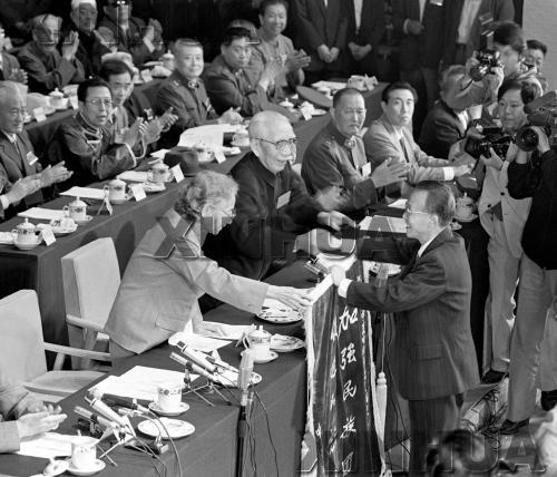 寧夏回族自治區(qū)成立30周年慶祝大會1988年9月23日在銀川舉行。圖為國家副主席王震、人大常委會副委員長雷潔瓊代表中央代表團(tuán)向自治區(qū)贈送賀幛。