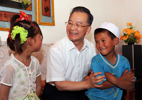 這是8月16日,溫家寶在西吉縣萬(wàn)崖村七組看望回族群眾時(shí),在村民黃生秀家與他的孫女、孫子親切交談。(新華社記者饒愛(ài)民攝)