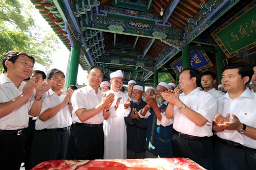 這是8月17日,溫家寶來(lái)到具有悠久歷史的銀川納家戶清真寺,看望宗教人士和回族群眾。(新華社記者饒愛(ài)民攝)