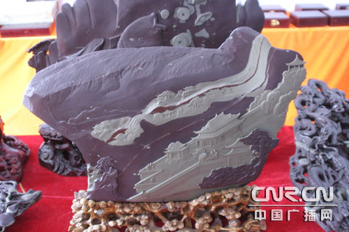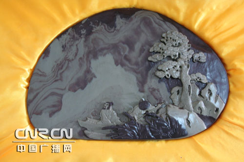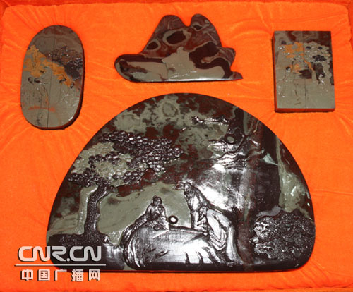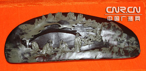 寧夏地方藝術(shù)文化瑰寶的賀蘭山石硯,是我國古老傳統(tǒng)文化的重要組成部分。 古詩有云:“賀蘭富研材,堆砌成小山;夙有臨池興,薄書儻余間!北蛔u(yù)為寧夏“五寶”之一的賀蘭石,形成于13億年前,它天賦異彩,自然形成“深紫”、“碧綠”兩色,紫綠相映,雅稱為“碧紫硯”,古雅清逸,豐姿俊美。經(jīng)過精雕細(xì)琢,石上的山水、人物、花鳥蟲草無不栩栩如生,讓人嘆為觀止。用賀蘭石制成的賀蘭硯與廣東端硯、安徽硯及甘肅硯相媲美。而賀蘭硯已有一千多年的歷史,用賀蘭石制作的硯臺也名重物稀,具有不吸水、發(fā)墨快、不損害筆尖等特點(diǎn)而名聞天下,早在清代就有“一端二歙三賀蘭”的美譽(yù)。1963年,時任國家副主席的董必武來寧視察時,曾賦詩盛譽(yù):“色如端石微深紫,紋似金星細(xì)入肌;配在文房成四寶,磨而不磷性相宜! 1997年香港特別行政區(qū)成立,寧夏回族自治區(qū)政府選送的禮品就是用賀蘭石制作的石硯“牧歸”。