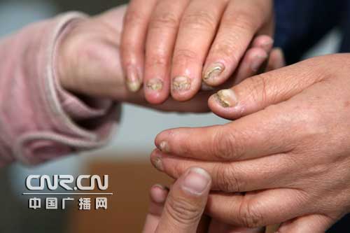 付洪秀雙手長(zhǎng)期與銅質(zhì)材料接觸,過(guò)敏反應(yīng)導(dǎo)致指甲脫落