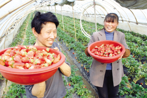 潤州區(qū)官塘橋的草莓種植戶滿懷豐收喜悅地采摘新品草莓。