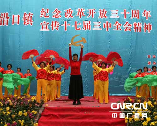 | 中廣網(wǎng)廣安12月22日消息(記者邵立肅 鄭軼 廣安臺(tái)蘇坤明 李鴻波)齊聲放歌、協(xié)手共舞。今天上午,四川廣安市武勝縣城南小學(xué)內(nèi)喜氣洋洋,人頭攢動(dòng),來自縣城內(nèi)9個(gè)街道社區(qū)的居民載歌載舞,紀(jì)念改革開放30周年暨宣傳黨的十七屆三中全會(huì)精神。