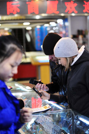 兩名俄羅斯游客在綏芬河市一商場挑選手機