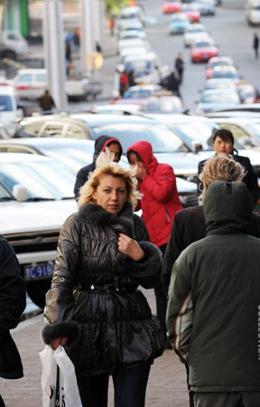往來在綏芬河市商業(yè)街頭的俄羅斯游客