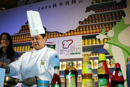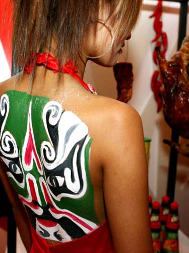 臉譜彩繪模特助威食博會(huì)。 9月17日,聯(lián)合利華飲食策劃在上海舉辦了一場(chǎng)“燴翠、跨界、新食尚”2008秋冬食博會(huì)。食博會(huì)旨在推動(dòng)中華美食文化,扶植飲食創(chuàng)新。來(lái)自川、粵、北方等各菜系150多名廚師借鑒法國(guó)、韓國(guó)等烹飪理念、技巧或食材,現(xiàn)場(chǎng)為參觀者端出一道道美味、時(shí)尚新佳肴。新華社記者張明攝 |