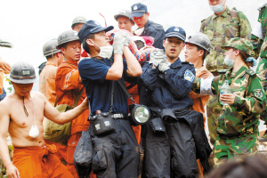 2008年,深圳特警在什邡紅白鎮(zhèn)救助負(fù)傷的群眾。