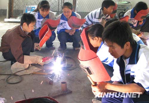 2005年10月16日,河南省新安縣職業(yè)學(xué)校機(jī)電專業(yè)的同學(xué)在實(shí)習(xí)車間上電焊課。