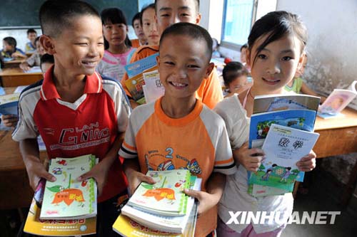 2008年9月1日,江西樟樹(shù)市第二小學(xué)五(1)班鄧文。ㄖ校┑韧瑢W(xué)領(lǐng)到免費(fèi)教科書(shū)。