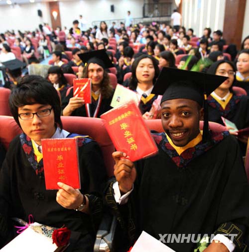 2008年6月30日,北京第55中學(xué)國(guó)際學(xué)生部舉行2008屆學(xué)生畢業(yè)典禮,來(lái)自20個(gè)國(guó)家和地區(qū)的62名“洋學(xué)生”領(lǐng)到了畢業(yè)證書(shū)。他們中的一部分將進(jìn)入北京大學(xué)、清華大學(xué)等國(guó)內(nèi)知名大學(xué)繼續(xù)學(xué)習(xí)。